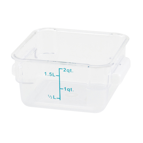Storage Container, 2 qt., 7-1/16" x 7-11/16" x 3-1/4"H, square, built-in handles, graduation markings in quarts & liters, temperature range: -40°F to 160°F, stain resistant, dishwasher safe, BPA free, polypropylene, translucent, NSF